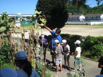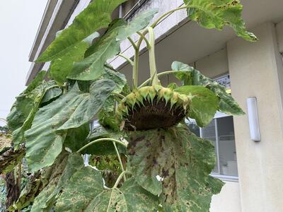 ひまわりは夏の終わりを感じているのか下を向いたままです。