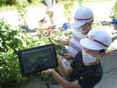 理科の学習です。夏に成長した植物を観察して、写真を撮ってタブレットに保存していました。この後教室で共有フォルダに移動し、気づいたことをみんなで共有します。3年生でもこのくりのことが普通にできるようになりました。