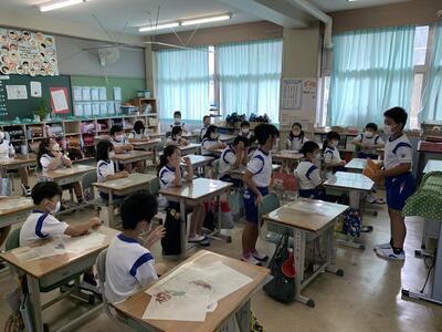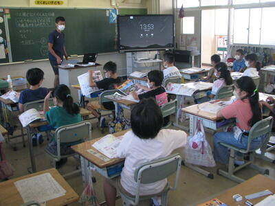 国語の学習です。先週の見学学習でアクアマリンふくしまへ行ったのですが、その時に気がついたことを「どうぶつ園のじゅうい」と比べながら話していました。