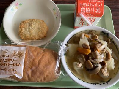 今日は、減量コッペパン、牛乳、ママレードジャム、とり肉と野菜のコンソメスープでした。久しぶりのパンでした。ごちそうさまでした。