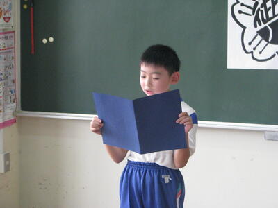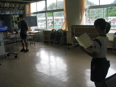 朝の会で、みんなの前へ出て発表していました。友達からは質問も出ていました。