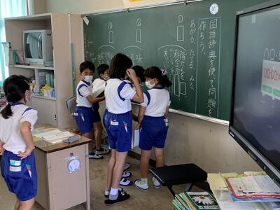 国語です。国語辞典を使って問題づくりをしていました。子供たちが積極的です。黒板にチョークで書くのも慣れています。