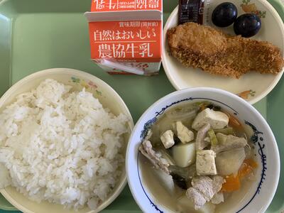 今日は、ご飯、牛乳、まだらフライ、ソース、県産大豆ペースト入りぶた汁、ぶどう2こ付きで、657kcalでした。ごちそうさまでした。