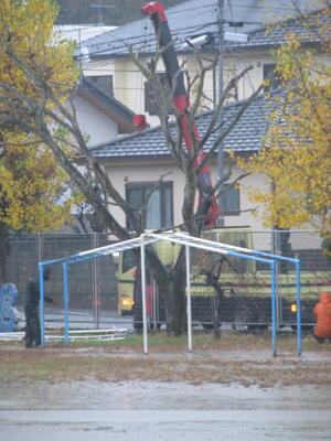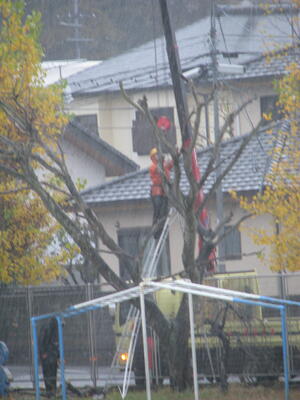校庭のネムノキが枯れてしまいました。原因は分かりません。枝が折れて落ちてきたり、倒木の心配があるため、切ることにしました。しかし、伐採の業者が来たのが大雨の日。「こんな大雨なのにやるの??午後2時頃、児童の下校頃には小ぶりになりますよ。」と聞いたところ、次の仕事が入っているので、すぐやるとのこと。一番ひどい大雨の時に伐採されました。でもこれで安全です。
