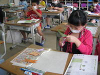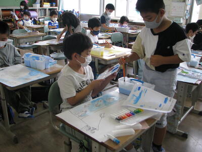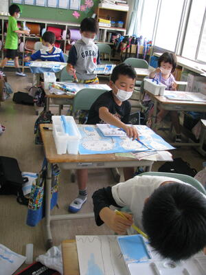 2年生の教室から聞こえてきます。家庭科・・・???いえ、図画工作科の絵の制作の授業です。