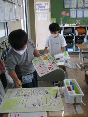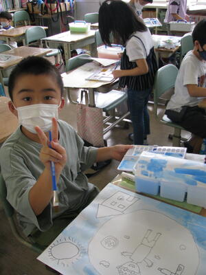 担任は、絵のバックは、絵の具に多くの水を混ぜて、しょうゆのような濃さで塗ることを指導していました。