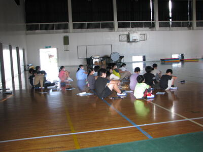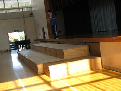 2年ぶりなので、教職員も人事異動で変わっており、「これ、どうするんだっけ?」「このコード、どこにつなぐんだっけ?」と分からないことが多い。体育館の緞帳(どんちょう・幕のこと)が壊れているとかいないとか。根本先生や、教頭、校長でああでもないこうでもないとワイヤーを巻いたり戻したりしながら、なんと、「直ったー!」とがんばりました。