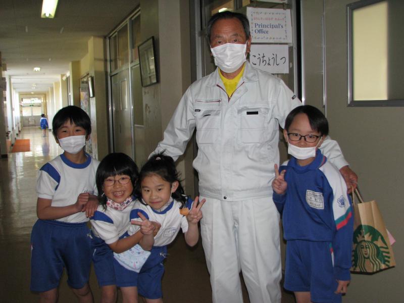 今日は、放送による全校集会でお別れの会を行い、児童が感謝の気持ちを伝えました。その後も用務員さんに会いに来る児童がたくさんいて、別れを惜しみ、ありがとうの気持ちを伝えました。