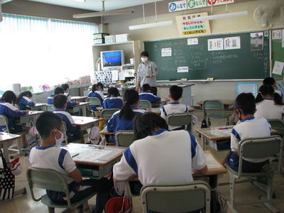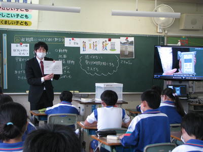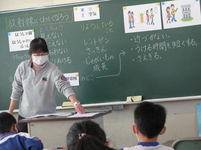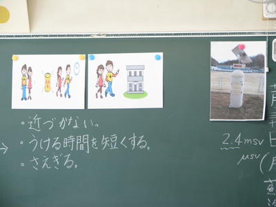 先日は、本校の理科主任でもある江尻先生が3年1組の児童で、放射線教育の授業を行いました。めあては、「放射線に詳しくなろう」です。見えない、匂わない、通り抜ける、感じないなどの放射線の特徴や、レントゲン、殺菌、ジャガイモの生長の抑制など、利用されていることなど、放射線を多量に受けることを避けリウタメに、近づかない、受ける時間を短くする、遮るもので身を守る等の学習をしました。