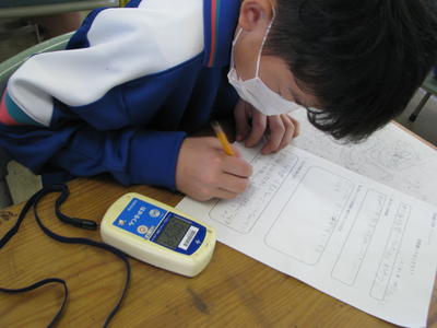 これは、鹿島先生の初任者研修の示範授業でもありました。このベテランの教諭の授業を参観した上で、今度は鹿島先生が5年2組で放射線の授業を行いました。なんと、鹿島先生は、この授業のために日曜日に三春の「コミュタン 環境創造センター」にいき、一人で見学・研修を受けてきたと言います。この授業に傾ける情熱、真摯な姿勢、素晴らしいですね。その成果が十分に現れた授業でした。見えない、匂わない、感じない放射線をどうやって意識するかを考え、放射線計を一人一人もって学校のあらゆる場所の放射線を計りました。放射線は常に宇宙から地球上の注がれ、0ではないことが分かりました。私が驚いたのは、校庭にもある放射線モニタリングポストは、何のために置かれているか、何を測定しているものかを知らない児童がクラスの半分以上いたことです。このことからも放射線教育の重要性が分かりました。