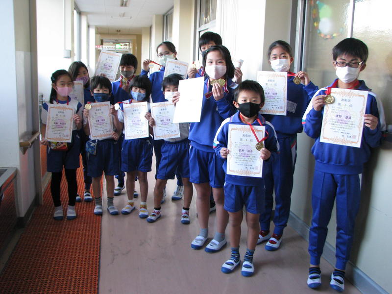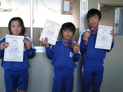 11月26日に行われた校内持久走大会の記録が出そろい、表彰式が行われました。御厩小の韋駄天たちです。各学年の男女第1位は、御厩小メダルが授与されます。こんなすばらしい校章のメダルは、私は他校で見たことがありません。また今年度は、新記録が3名出ました。3年女子、4年男子、5年男子です。新記録を出した児童には、別に新記録メダルが贈られます。