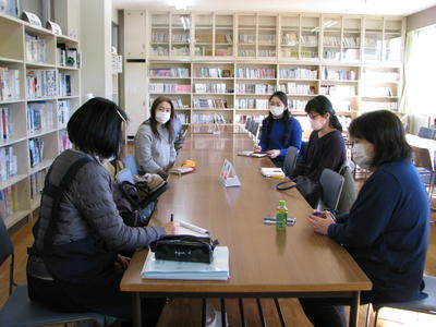 司書の松島さんとともに、打ち合わせをしました。図書室もソーシャルディスタンスです。