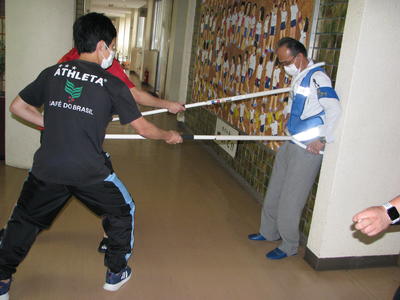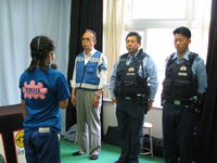 学校に不審者が侵入したという想定で、本校職員が不審者対応の仕方やさすまたの使い方の指導を受けました。さすまたも使い方次第では逆に先生方が危険になります。学校の精鋭男子教員チームは、持ち方、構え方、ねらいの定め方、立ち位置など詳しく具体的に指導を受け、万が一の事態に的確に対応できるよう、訓練しました。児童は、今回は各教室を施錠し、教室内で一カ所に集まり、息を潜めて存在を消したり、教室の窓に目隠しをして、児童の姿が見えないようにしたり、出入り口に机、椅子を積んでバリケードにしたりしながら、教室に籠城する作戦で訓練しました。