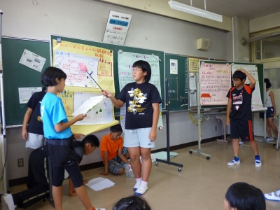 これまでに学習してきた、好間川の水生生物や水質についてまとめ、発表しました。講師である「夏井川流域の会」の橋本さん等が学校を訪れ、子どもたちの発表の様子を参観しました。