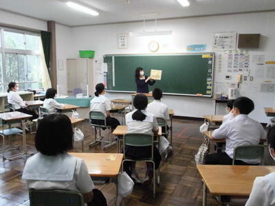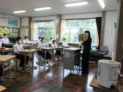 2020年7月14日 08時26分今日は学校司書の大谷先生が1年生に「空気がなくなる日」というタイトルの本の読み聞かせを行いました。