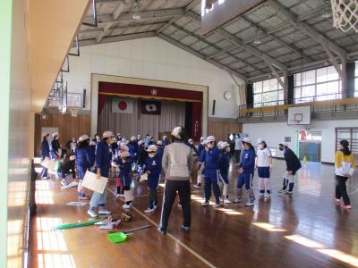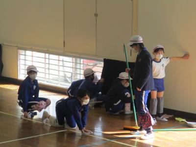 今日の清掃は「たてわり班清掃」。卒業式に向けて、全校生で体育館の清掃を行いました。