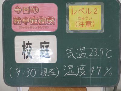 暑い季節がやってきました。今年も宮小学校では、熱中症対策として、熱中症指数を昇降口に掲示します。レベル4では外の活動を取りやめます。