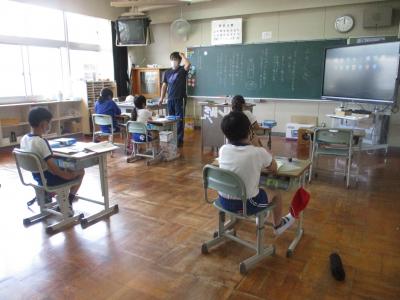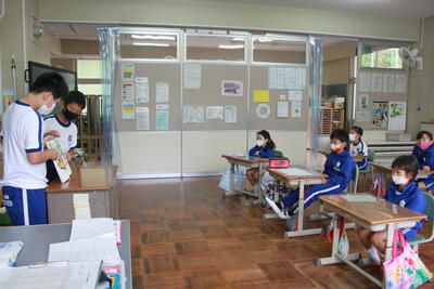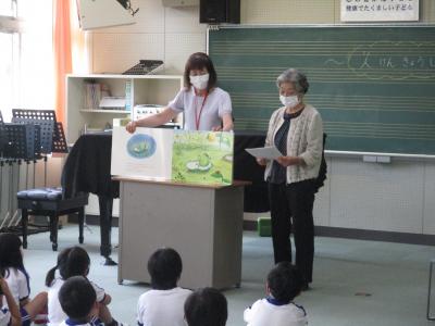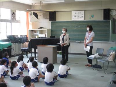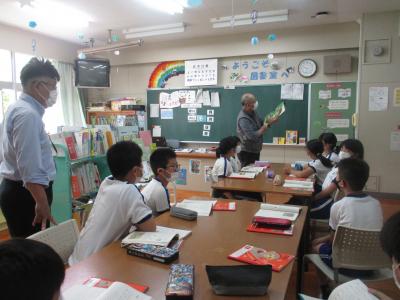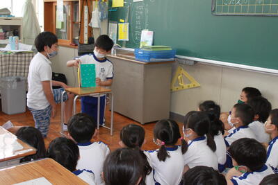 図書委員会の児童が、朝の読書の時間に、1年生と2年生に向けて読み聞かせを行いました。