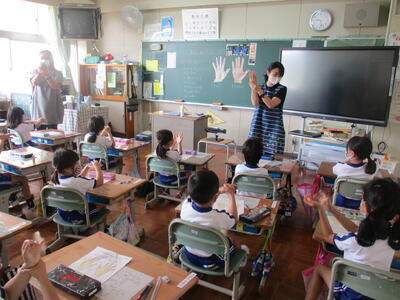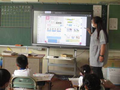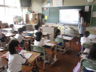 6年生英語科の様子。英語サポーターの先生とともに、会話文をならって、みんなで交流します。