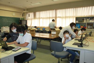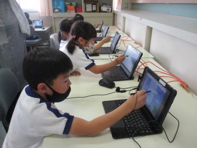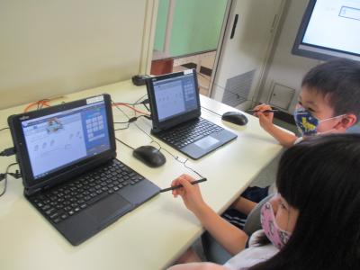 「電源は?」「タッチペンって何?」いろいろなはてなを、ICTサポーターの先生と担任の先生が手分けして教えていきます。