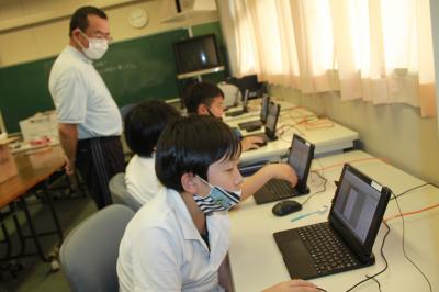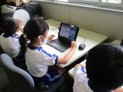 インドアクラブは,コンピューター室で名詞づくり。ICTサポーターさんに質問したりしながらカラフルな名刺を作っていました。