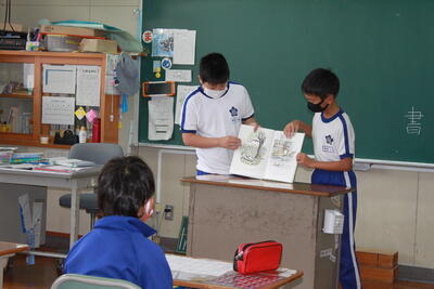 5年生国語。古典の学習をしています。学校司書の先生にも協力いただいて、古典の魅力について学習しました。