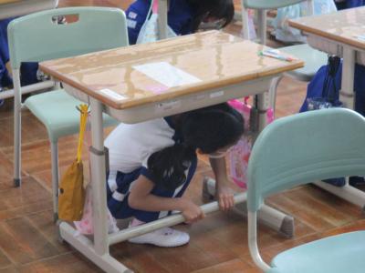地震発生を想定して、机の下へ