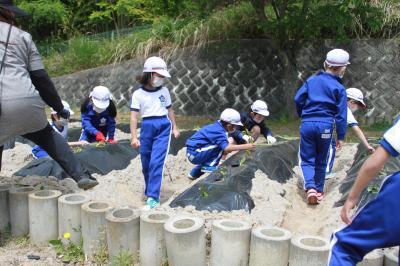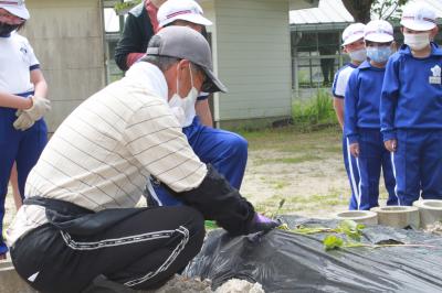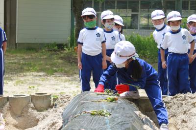 1,2年生とおひさま学級の子どもたちが、近所の矢吹さんにご指導いただいてサツマイモの苗を植えました。