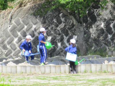 昨日植えたサツマイモに水やりをする2年生