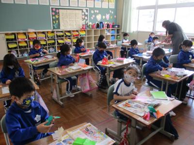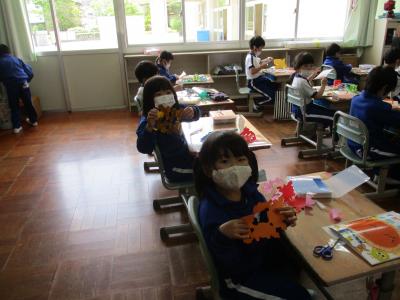 図工で折り紙を切り抜いて形を楽しむ1年生。