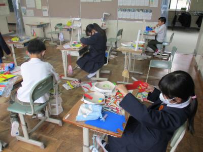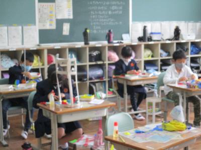 3年生も図工で工作に挑戦中。立体作品に悪戦苦闘。