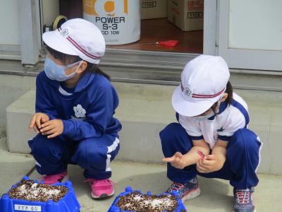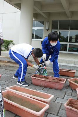 1年生が自分の植木鉢に朝顔の種をまきました。