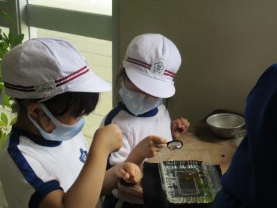 その後、昨日からメダカが卵を生み始めたので、1年生がメダカを観察に来ました。