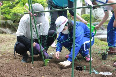 おひさま学級。きゅうりとなすの苗を植えました。
