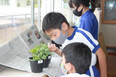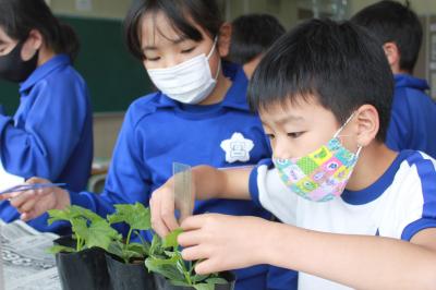 4年生がヘチマの苗を観察しています。