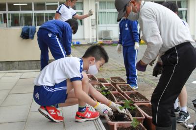 おひさま学級と5年生はプランターに花の苗を植えました。