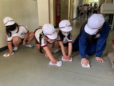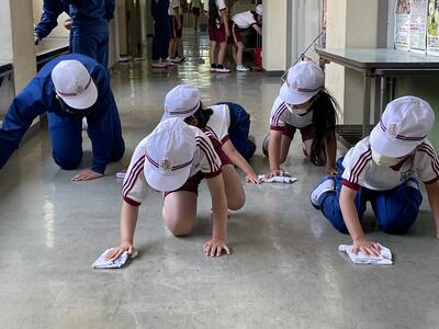 本校の清掃の時間は、①はじめの整列、②班長を中心にめあてと活動内容の確認実施、③清掃活動、④おわりの整列、⑤班長を中心に清掃箇所の確認と活動の反省、⑥おわりの礼という流れで進めています。
