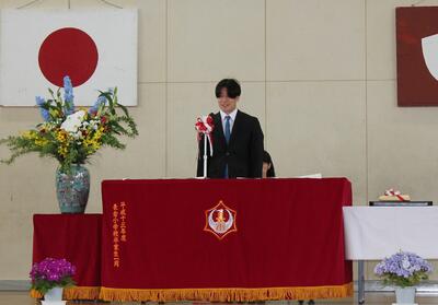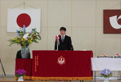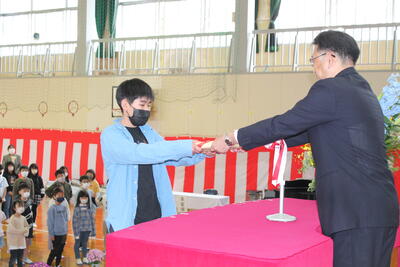 教科書授与は6年生代表へ。名前を呼ばれると大きな声で返事をしました。早速、呼びかけたことを実践してくれて嬉しかったですね。そして、最高学年6年生としての心意気とプライドを堂々と全校生に示してくれました。