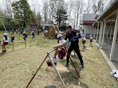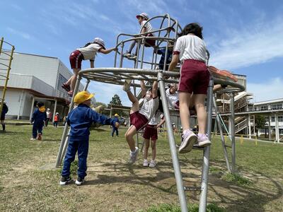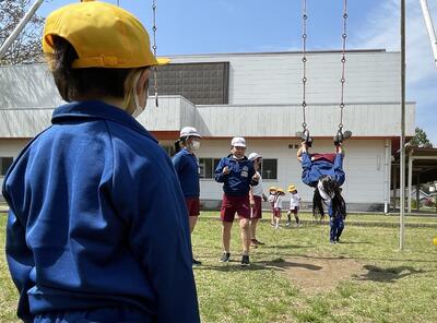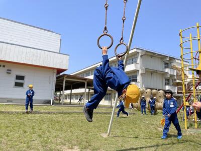 時々やってくる上級生。おんぶしたり、手をつないだりして楽しい時間を過ごしていました。遊具の中には吊り輪があります。6年生の妙技?!をじっくり観察する1年生。そして次の日、その1年生はオリンピック選手並みにくるくる回転しておりました、驚きました!先輩に勝ったか?