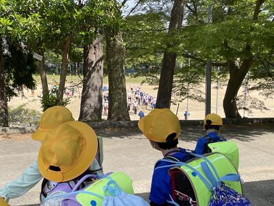 1年生が下校する頃、5・6年生は鼓笛の練習をしていました。「すごいぞ!」と言う1年生、一方で「校庭で演奏するとなかなか合わないな!」と言う6年生、それぞれに感じ、学ぶ姿がとても印象的でした。