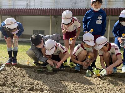 3年生の朝は、畑に植えたキャベツに水をあげることからスタート。美味しく育てているキャベツ、自分のためでなく、モンシロチョウのためとのこと。毎日、これこそ卵?葉っぱを食べた跡がある!このちっちゃいのは幼虫?と、先生も一緒に夢中になって観察に励んでいます。