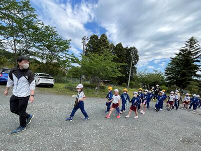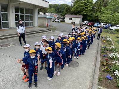 2023年5月6日 12時00分低学年1・2年生は、学区内にある2つのテーマパークが目的地。五反田公園と上湯長谷公園(通称ガニラ公園、略称ガニ公、地元通は「ガニラー」と伸ばして発音)へ。「オレ、いつも五反田公園で遊んでっから」と自慢気に語っていた男子児童、続けて「でもガニ公はあんまり行かない」との声に、「わたしはガニ公知ってる!」と反応する隣の女子児童。「何あるの?」「すべり台!」「それ五反田公園にもあるし」「どんなの?」...と語り合っちゃって、行く前から何だか楽しそう。そして、白色帽子の2年生と黄色帽子の1年生がしっかりと手をつないでいざ出発!学校探検で1・2年生は交流していましたので、頼り頼られ、一歩一歩前進していきました。横断歩道は手をあげて、まわりをよく見て歩きましょう!