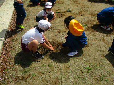 続いて、ガニ公へ。やっぱり子どもたちは遊びの天才!ここでも新たな遊具を堪能したり、広場で追いかけっこをしたり、砂場での芸術祭、草花の観察等々で大盛り上がり。これなんですか?と先生への質問、そして「ここに秘密基地があるんだよ!」と教えてくれて...。それでは秘密にならないのでは?とのツッコミをしたとかしなかったとか。