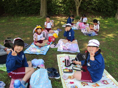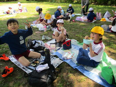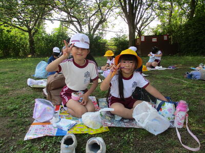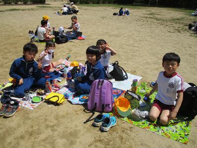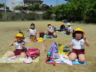 青空の下、思い思いの場所でお弁当タイム。大好きなおかずを作ってもらったんだ!一緒に作った!と自慢し合いながら楽しい時間を過ごしました。