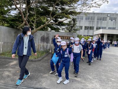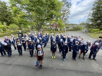2023年5月7日 12時00分中学年3・4年生。目的地の21世紀の森公園わんぱく広場でわんぱくになろう!と、朝から元気元気!特に3年生は、初めての学区外へのお出かけとあって、わくわく感があふれ出ておりました。元気に「行ってきまーす!」。