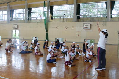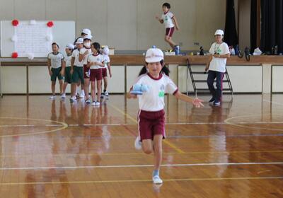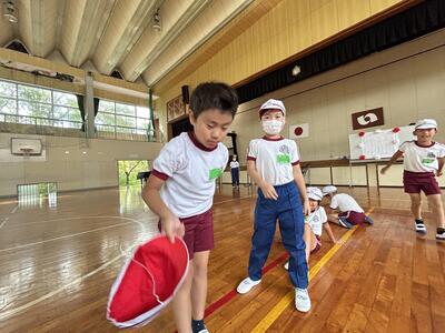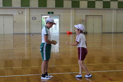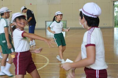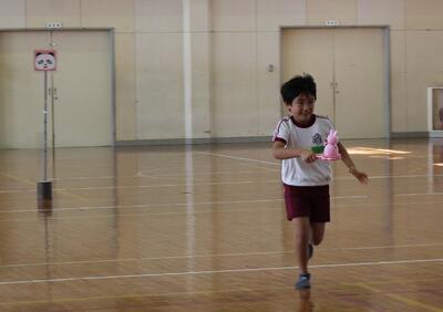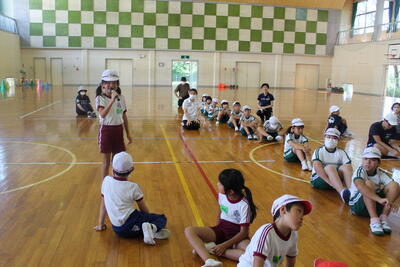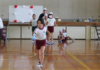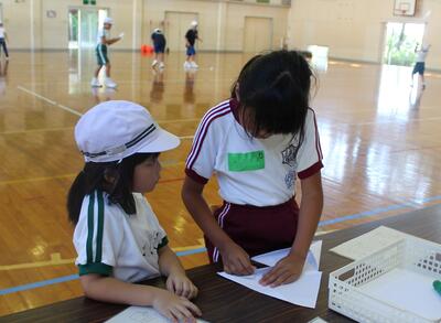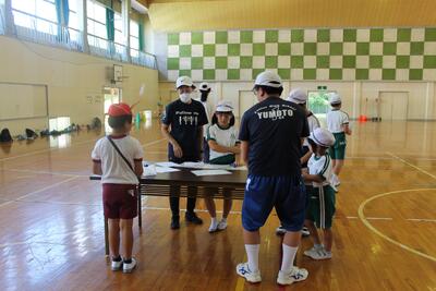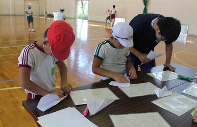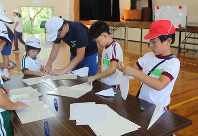 その後、チーム対抗で「アニマルスプーンリレー」「くつとばし」「BIGオセロゲーム」「紙飛行機づくりと飛ばしっこ大会」にチャレンジしていきました。お互いあまり無理を強いない優しいかかわり合いがGOOD!その中でも中学生のリーダーシップはお見事!小学生同士でも後輩に頼りにされ嬉しそうに接する先輩の姿が素敵!学校間の垣根を越えた交流がどんどん進行していきました。