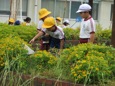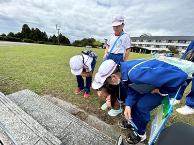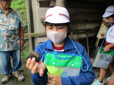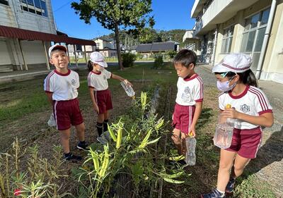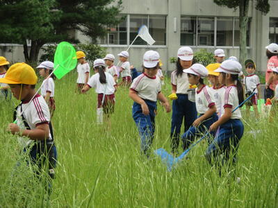 見学学習でさらに仲良しになった1・2年生は、昆虫採集にもチャレンジ!でも虫さんたちの動きがすばしっこくて、かごの中は毛虫が多かったのだとか...。