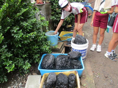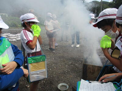 それでは石炭を燃やしてみましょう!ということで着火。わくわくしていた子どもたちでしたが、石炭を燃やし始めると「うぇ~!」と悲鳴を上げて...。そうなんです、石炭は一度燃えてしまえ気になるのは煤くらいなのですが、着火時は何とも言えない匂いが発生するんですね。「むがしは、火をつける仕事は子どもの仕事だったんだ!」便利な時代になったことを実感しましたね。