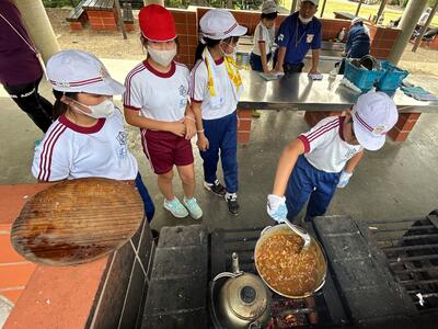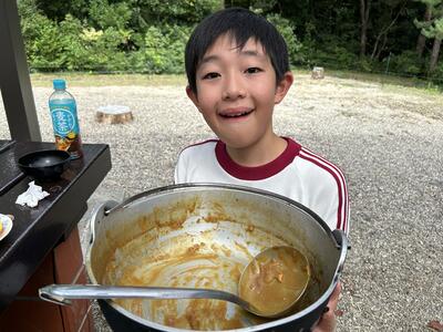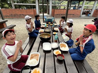 写真だけ見るとあれですが、現場の実際の声をいくつか紹介。包丁持つ手が震えるんですけど! 玉ねぎはあんたに任せた! 薪に火をつけるどころかマッチに火がつかないんですけど! 研いでも研いでもお米の研ぎ汁が透明にならないよぉ、それ研ぎ過ぎじゃん! 炎が顔まで上がってるのに何で薪入れるのよ!熱くて鍋を運べない、やばい、焦げる!等々。先生方も子どもたちと一緒になって熱いご指導、大人の振る舞いはどこへやら...。だって美味しいカレーを食べたいじゃないですか!...ごもっともでございます。