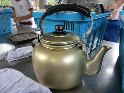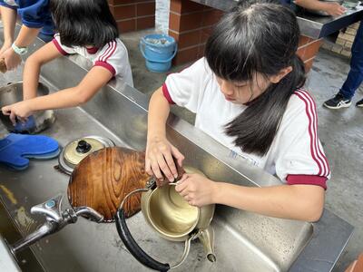 煤やおこげで真っ黒になった鍋ややかんを徹底的に磨き上げ、かまどや水回り、調理台は御覧の通りでございます。しおりの中に合言葉が記されてありまして、「来たときよりも美しく!」までは昨年、今年はそれに「残していいのは感謝の気持ちだけ!」が加わっておりました。担任の先生のご指導とともに、それに乗っかった子どもたちもまたお見事でございました!